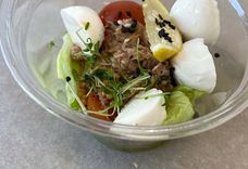 90 г • салат айсберг, черри, огурец свежий, сыр моцарелла, тунец консервированный, заправка, зелень, лимон