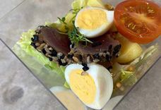 76 г • салат айсберг, черри, яйцо перепелиное, тунец на гриле, картофель отварной, заправка, зелень