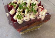 120 г • сельдь,картофель отварной, морковь отварная, свекла отварная, майонез, зелень