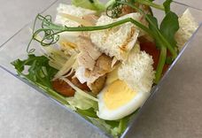 85 г • салат микс, черри, яйцо перепелиное, соус цезарь, курица, сыр пармезан, гренки