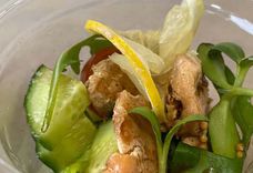 75 г • микс салата, черри, огурец свежий, лосось гриль, лимон, заправка, зелень