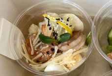 100 г • салат микс, черри, яйцо перепелиное, соус цезарь, креветки, сыр пармезан, гренки