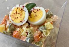 150 г • картофель, морковь, ветчина, огурец маринованный, яйцо, горошек, майонез