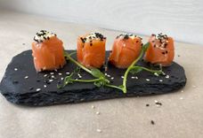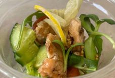 75 г • микс салата, черри, огурец свежий, лосось гриль, лимон, заправка, зелень