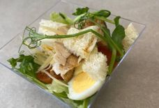 85 г • салат микс, черри, яйцо перепелиное, соус цезарь, курица, сыр пармезан, гренки