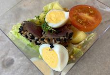 76 г • салат айсберг, черри, яйцо перепелиное, тунец на гриле, картофель отварной, заправка, зелень